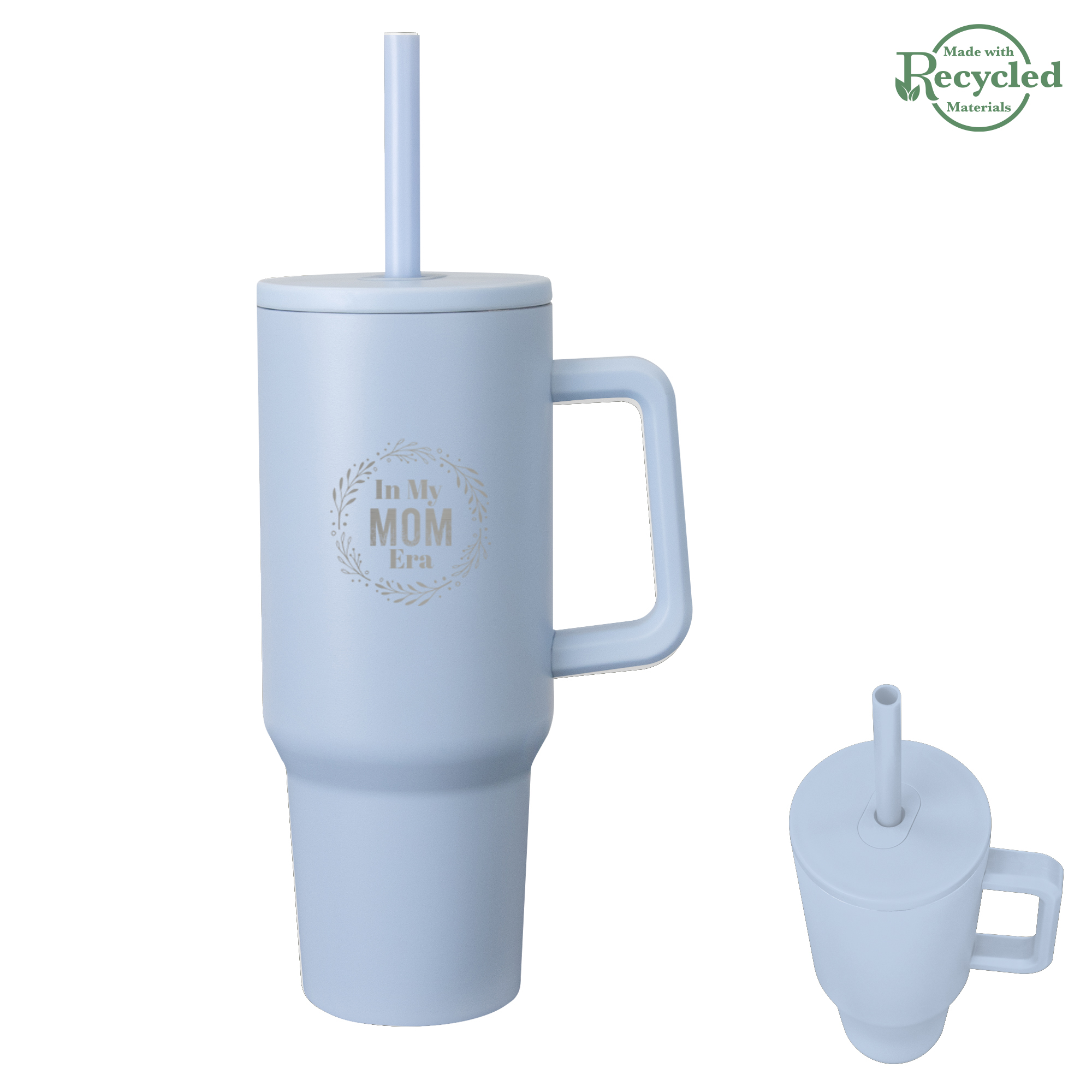 Stainless Steel Outer And Inner | Stainless Steel Tumbler With Handle | Powder Coated Finish | Double Wall Construction For Insulation Of Hot Or Cold Liquids | Keeps Drinks Cold Up To 24 Hours And Hot Up To 8 Hours | Screw On, Spill-Resistant Lid with Straw Hole and 12" Straw | Vacuum Insulated | Meets FDA Requirements | BPA Free | Hand Wash Recommended.